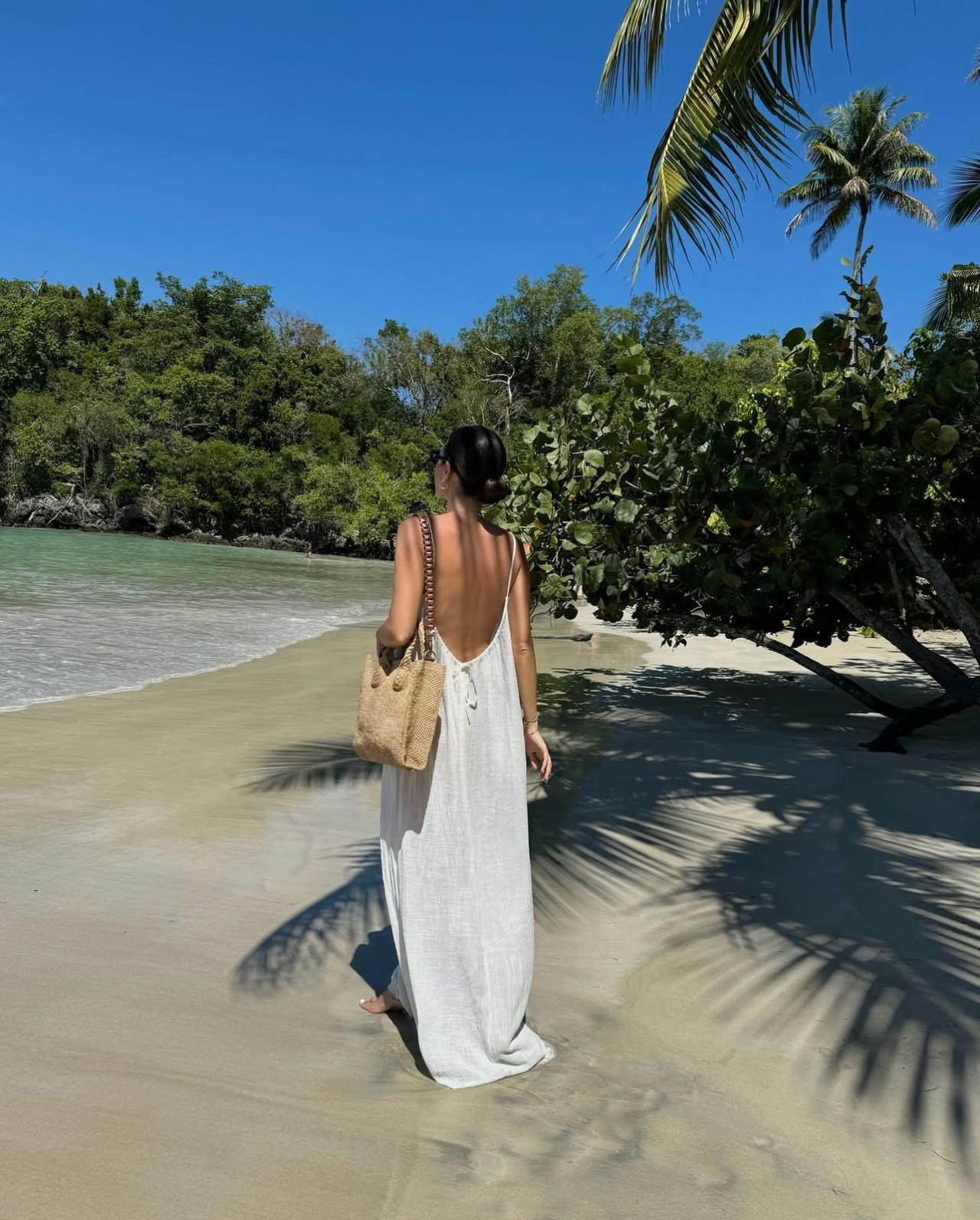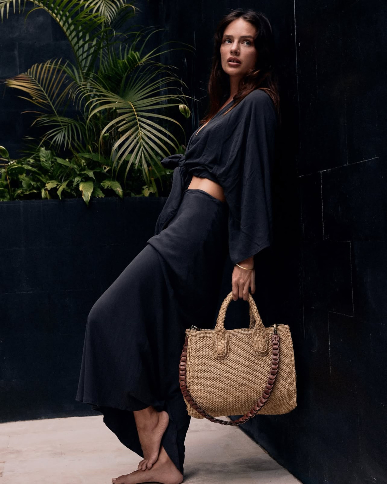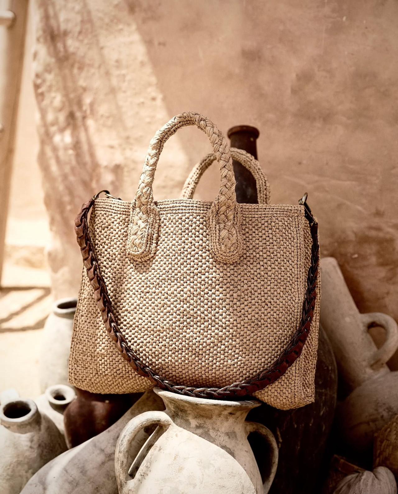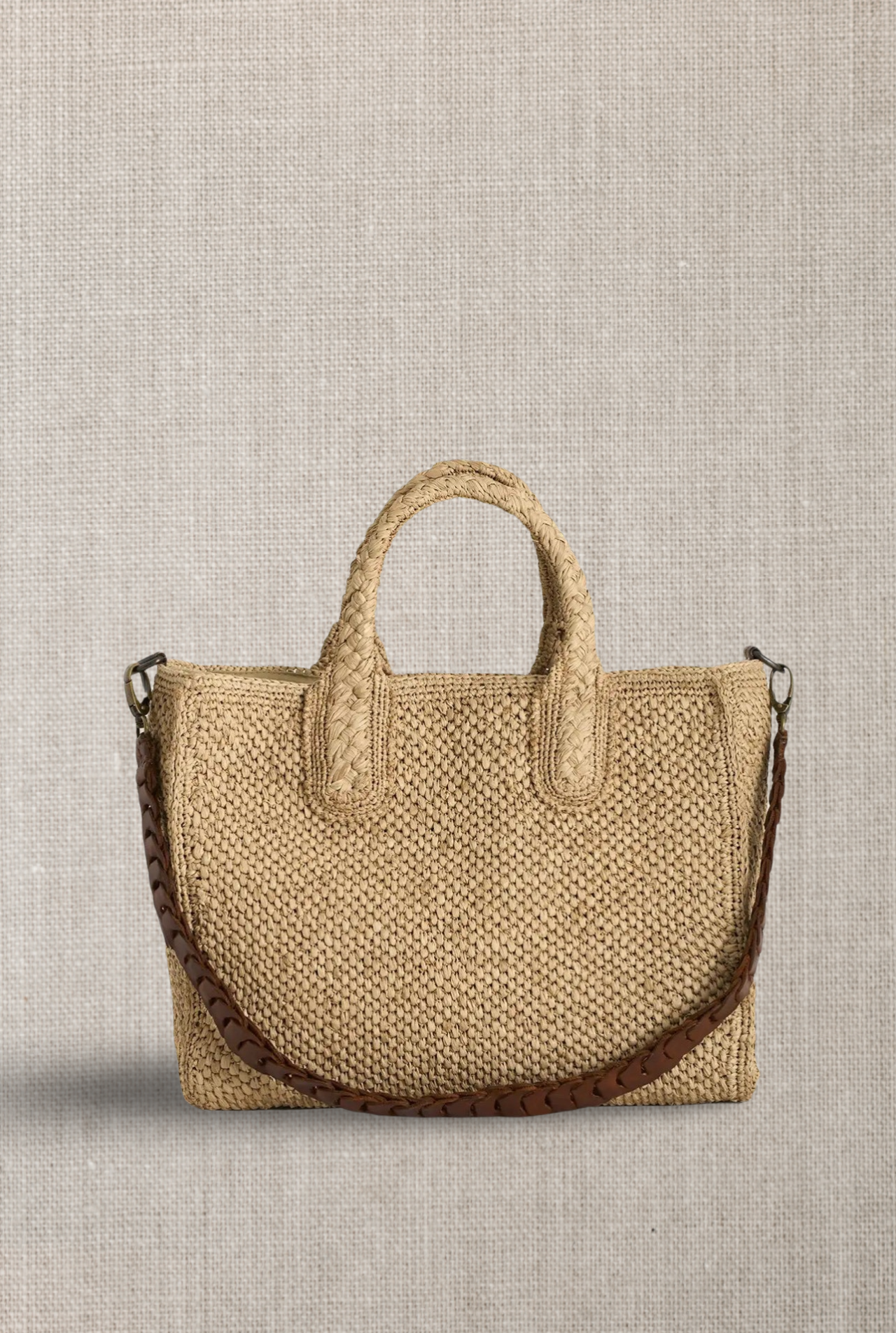 Removable leather shouldr strap and raphia handles .